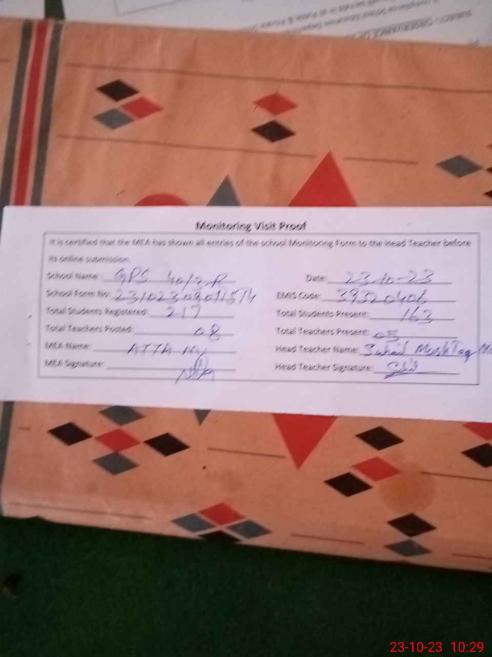 | Attendance Register | Head Teacher | MEA with School | Visit Proof |