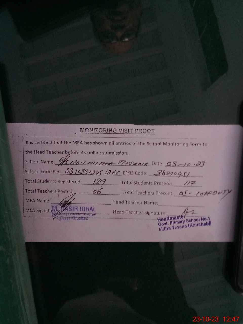 | Attendance Register | Head Teacher | MEA with School | Visit Proof |