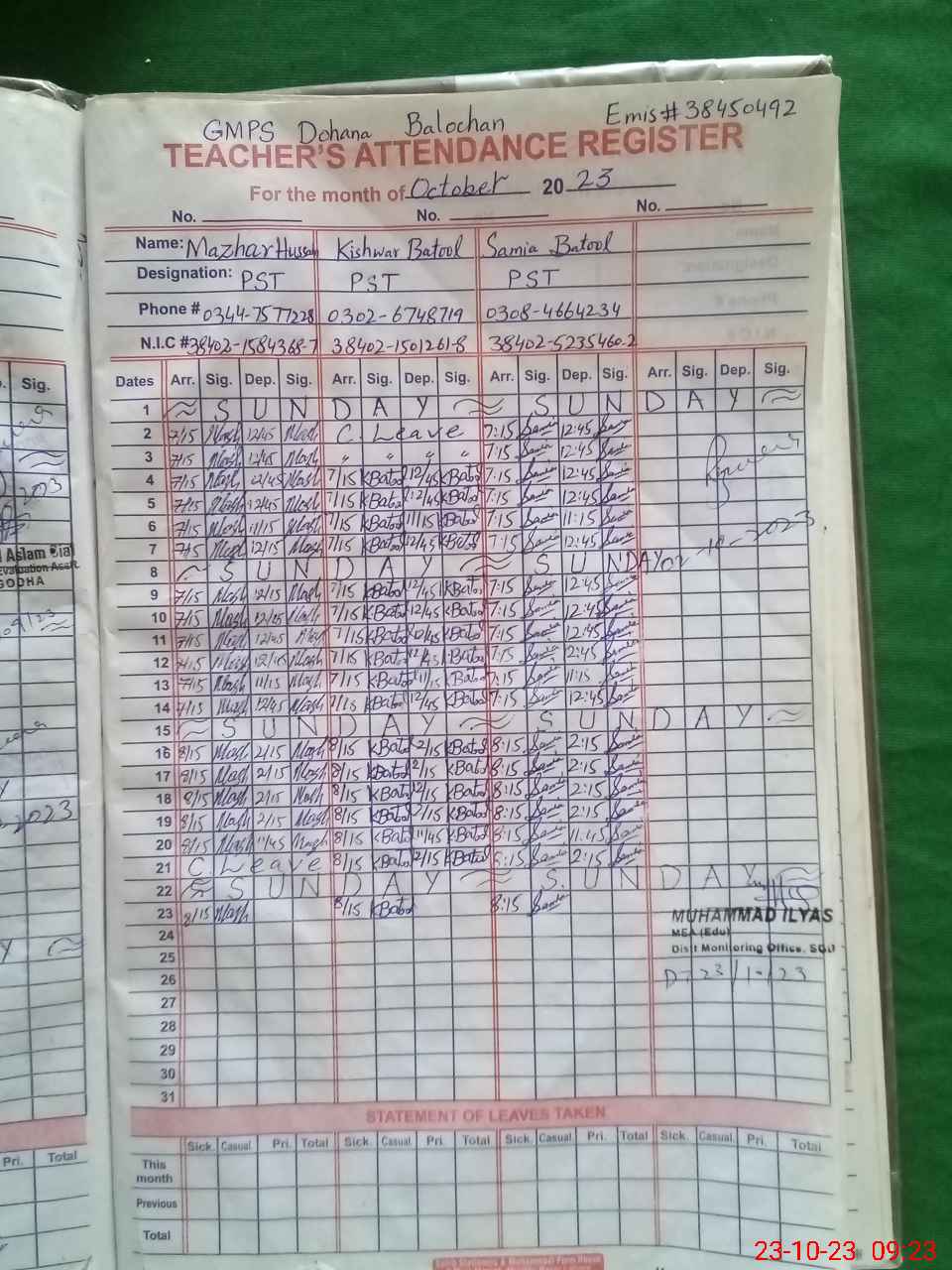 | Name: SA**** BA**** Designation: (School Headmaster's/Headmistress's) PST Phone/Cell Number: 03**** |