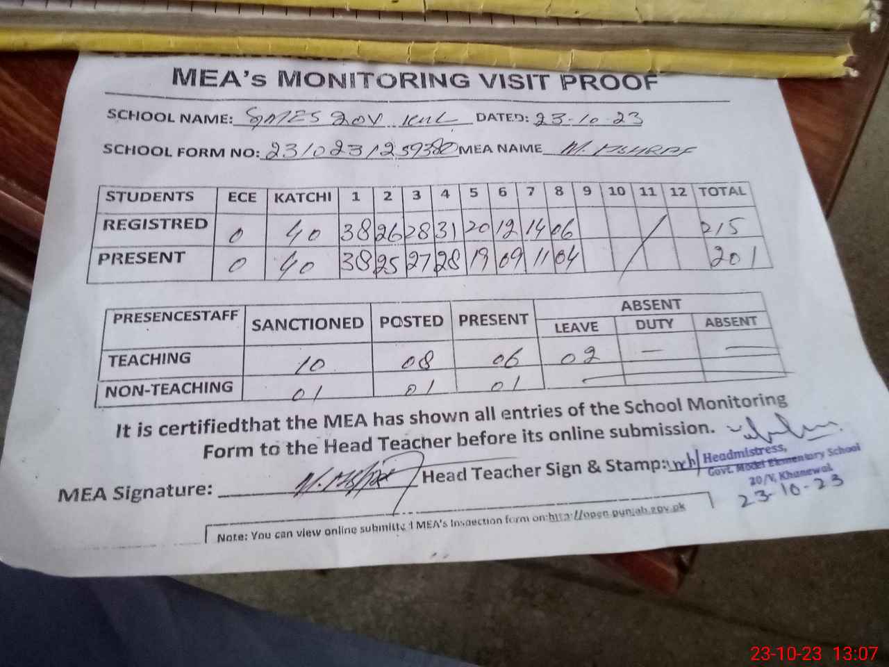 | Attendance Register | Head Teacher | MEA with School | Visit Proof |