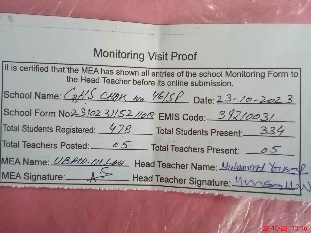 | EMIS Code: 39210031 | Name of School: GHS CHAK NO. 46/SP PAKPATTAN | |||