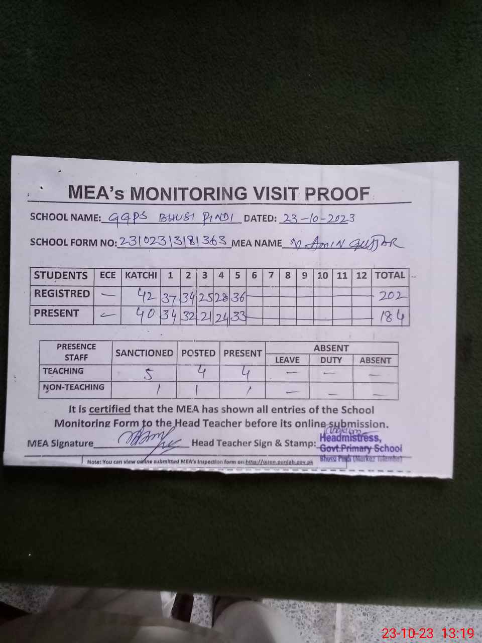 | Attendance Register | Head Teacher | MEA with School | Visit Proof |