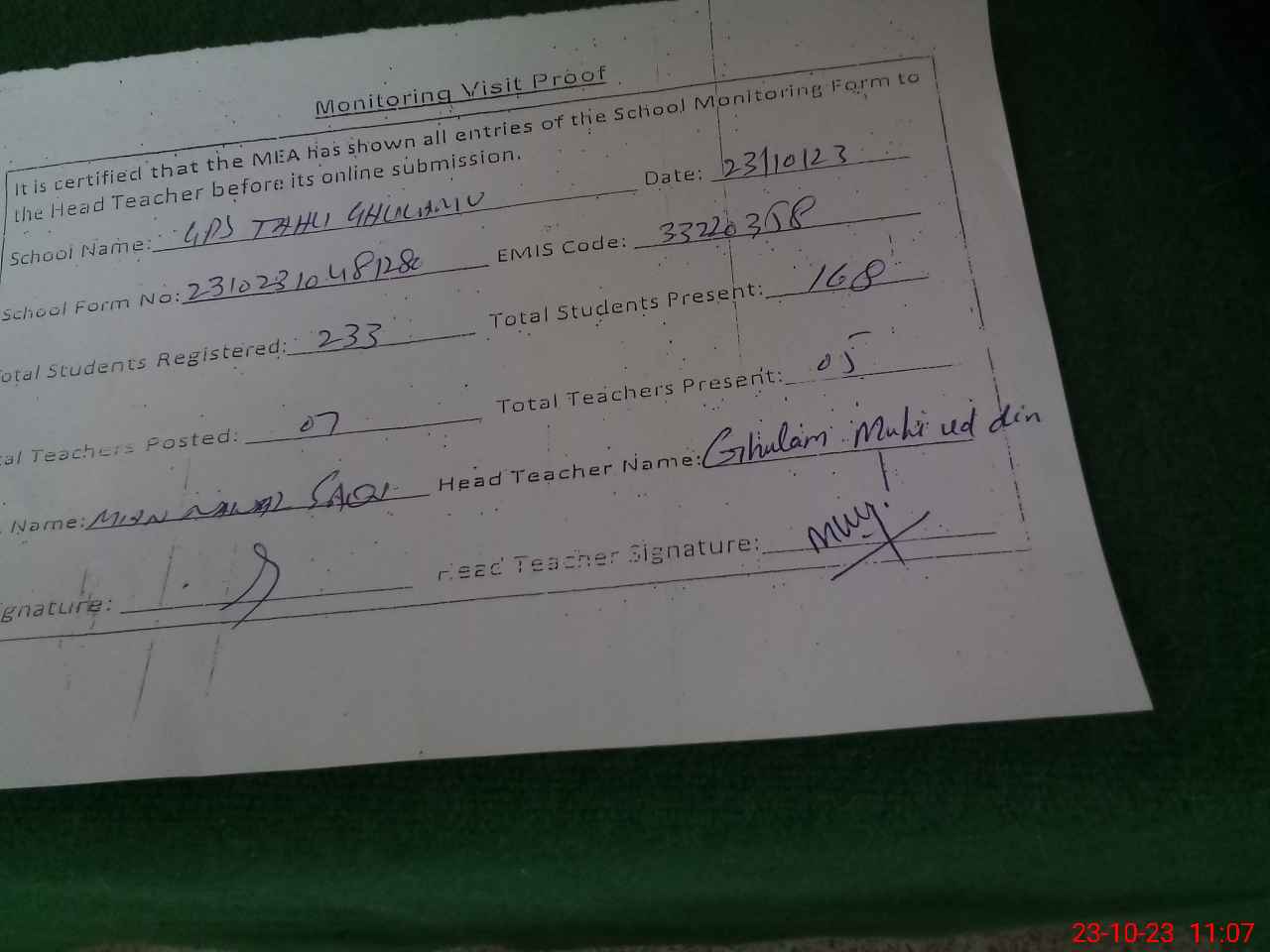 | Name: Mu**** Sh**** Ta**** Designation: (School Headmaster's/Headmistress's) PST Phone/Cell Number: 03**** |