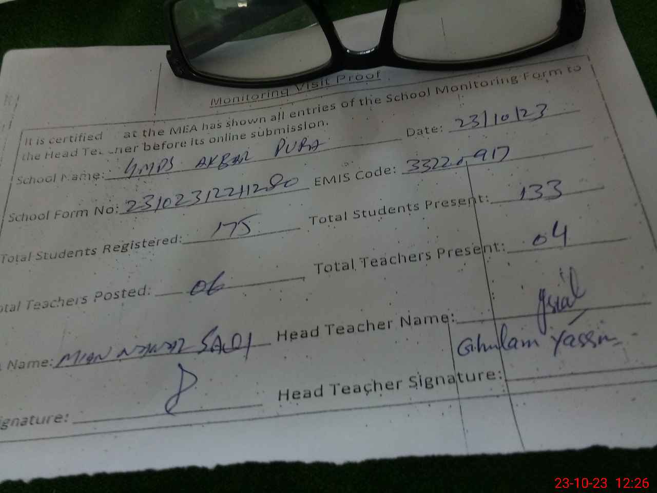 | Attendance Register | Head Teacher | MEA with School | Visit Proof |