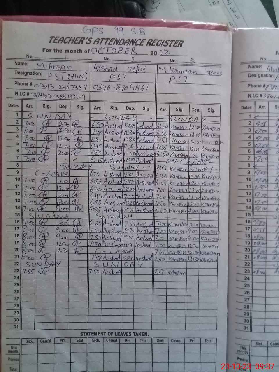 | CNIC | Full Name | Designation | R/C | Absence During Last Calender Month |