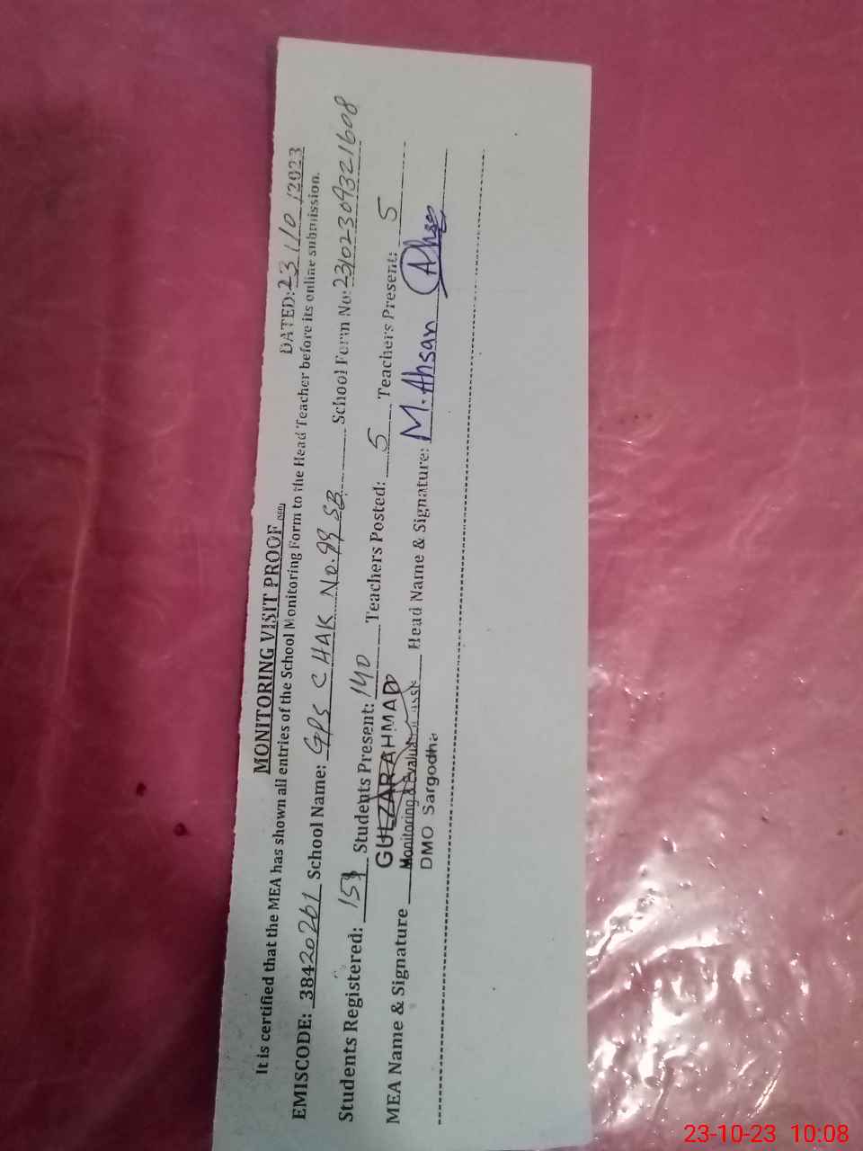 | Attendance Register | Head Teacher | MEA with School | Visit Proof |