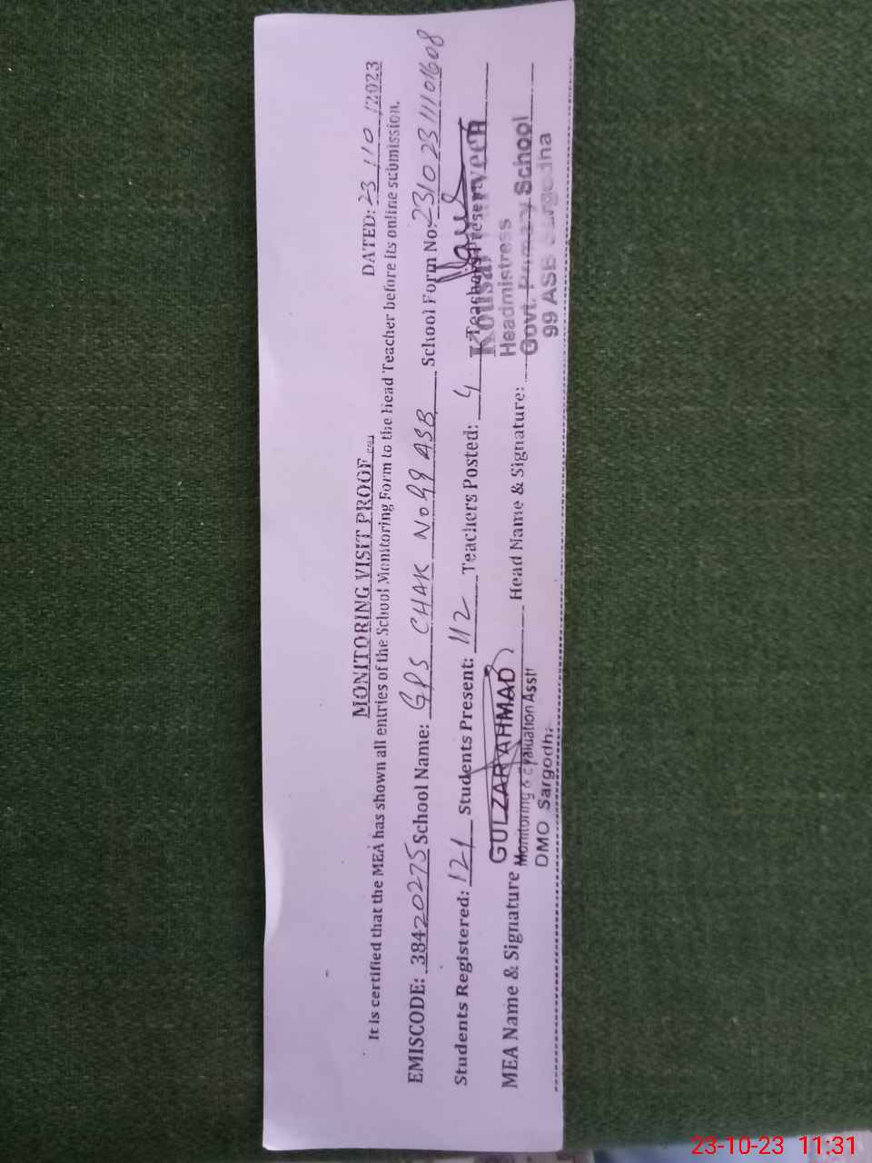 | Attendance Register | Head Teacher | MEA with School | Visit Proof |