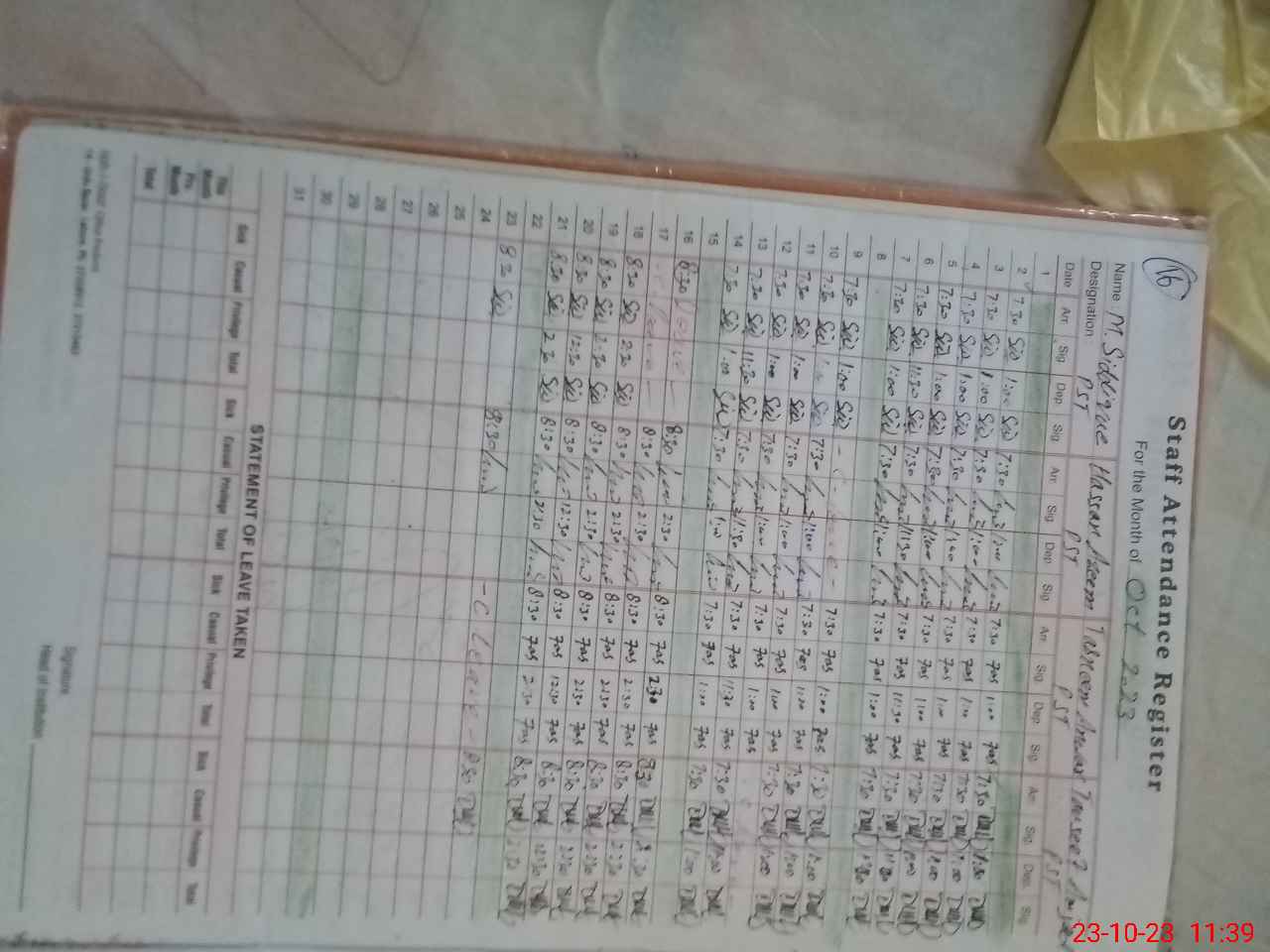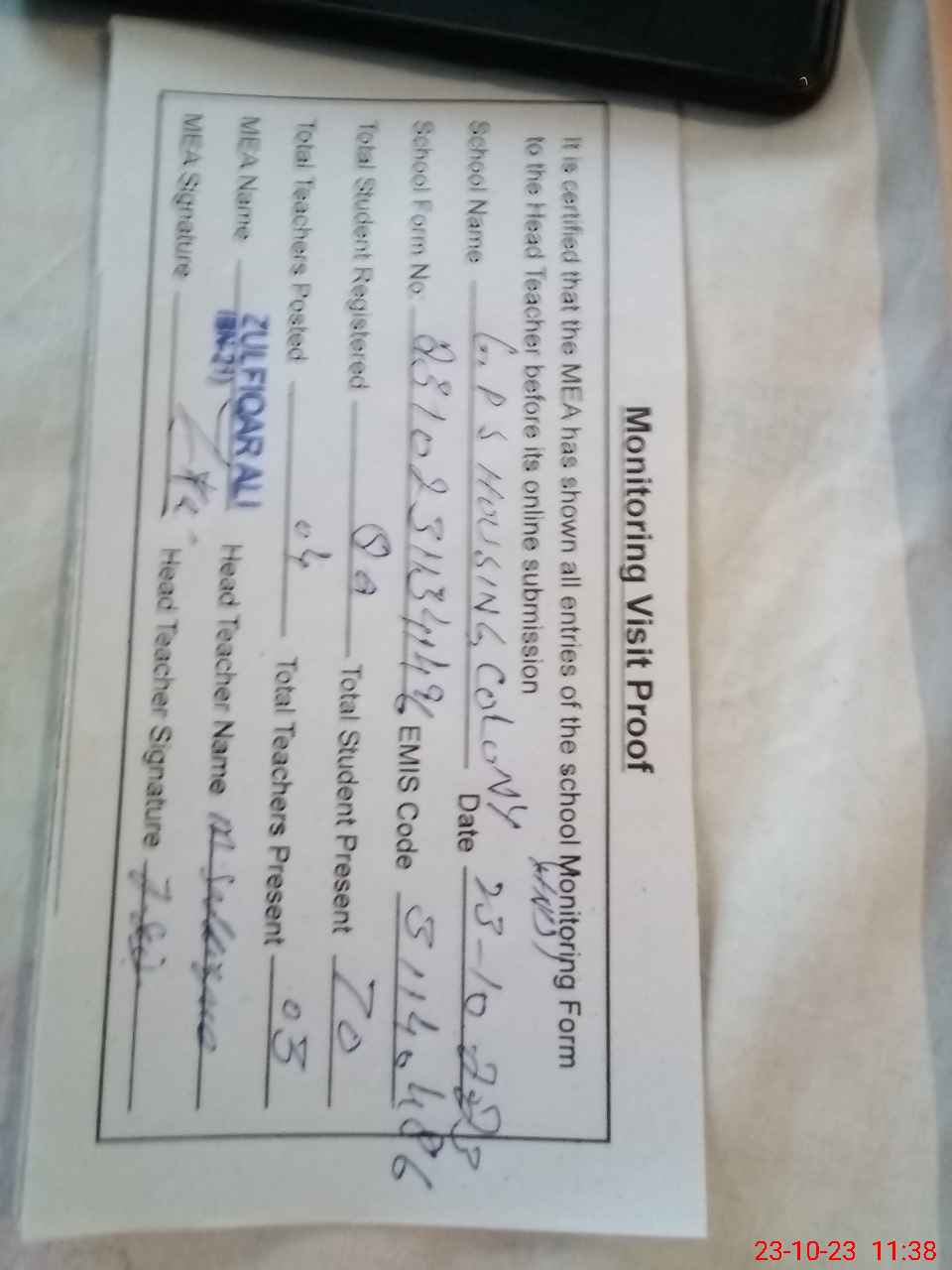| Monitoring Date: 23-10-2023 | Start Time: 23-10-2023 11:12 AM | End Time: 23-10-2023 11:39 AM | Name of MEA: Zu**** Al**** BN**** | |