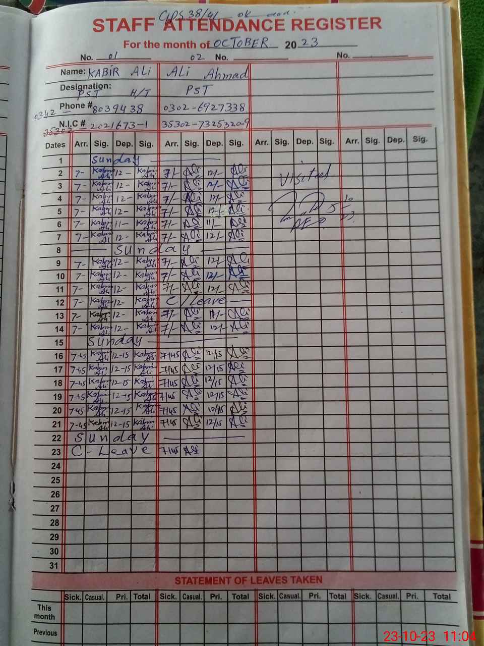 | Name: AB**** SA**** Designation: (School Headmaster's/Headmistress's) PST Phone/Cell Number: 03**** |