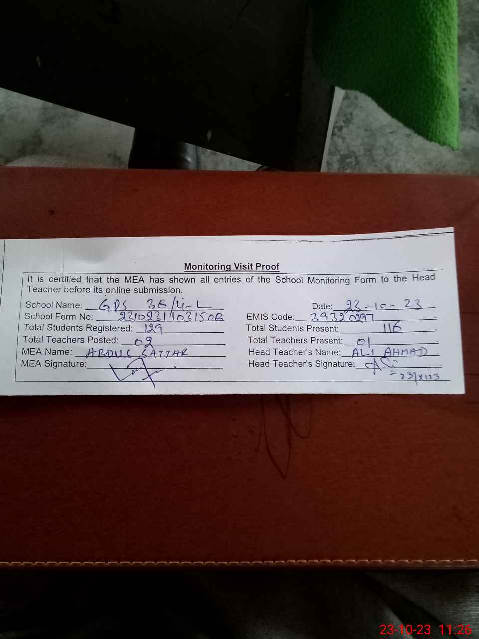 | Attendance Register | Head Teacher | MEA with School | Visit Proof |