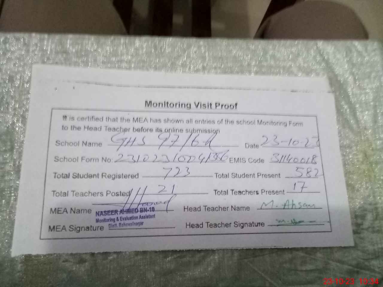 | EMIS Code: 31140018 | Name of School: GHS CHAK NO. 97/6-R | |||