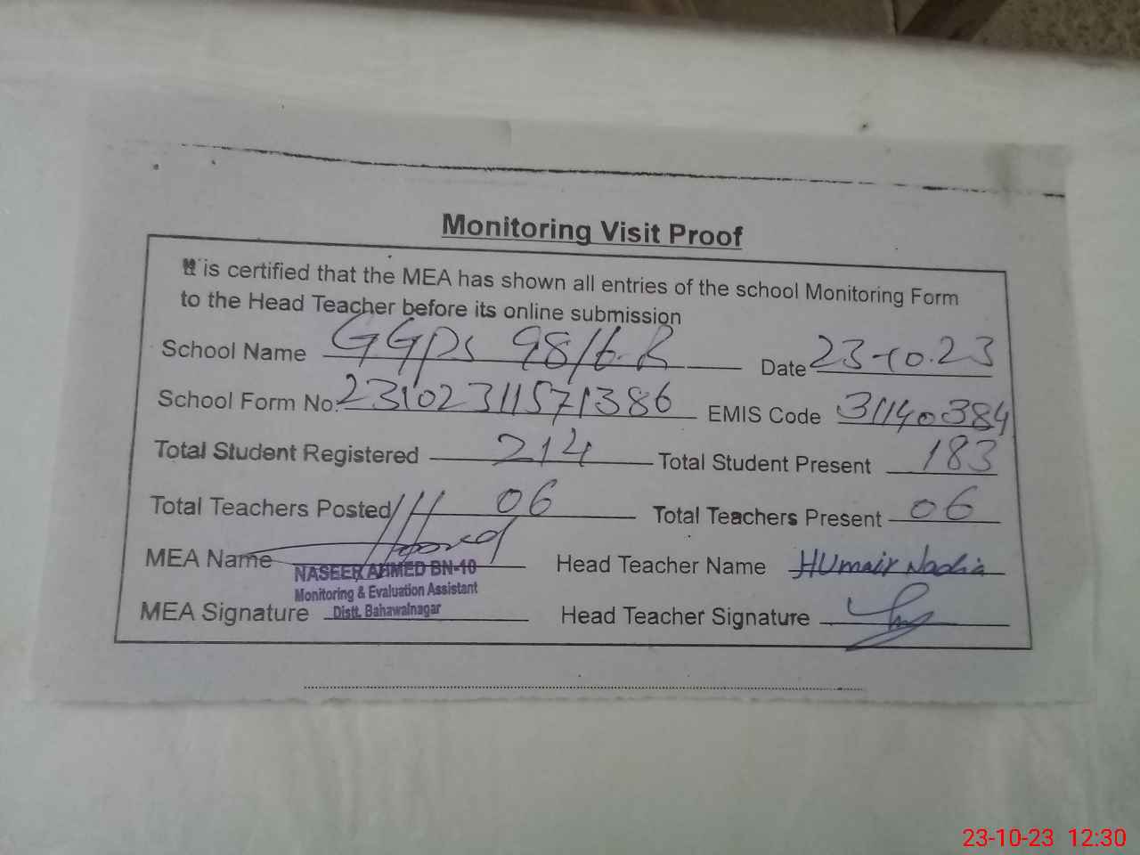 | Attendance Register | Head Teacher | MEA with School | Visit Proof |