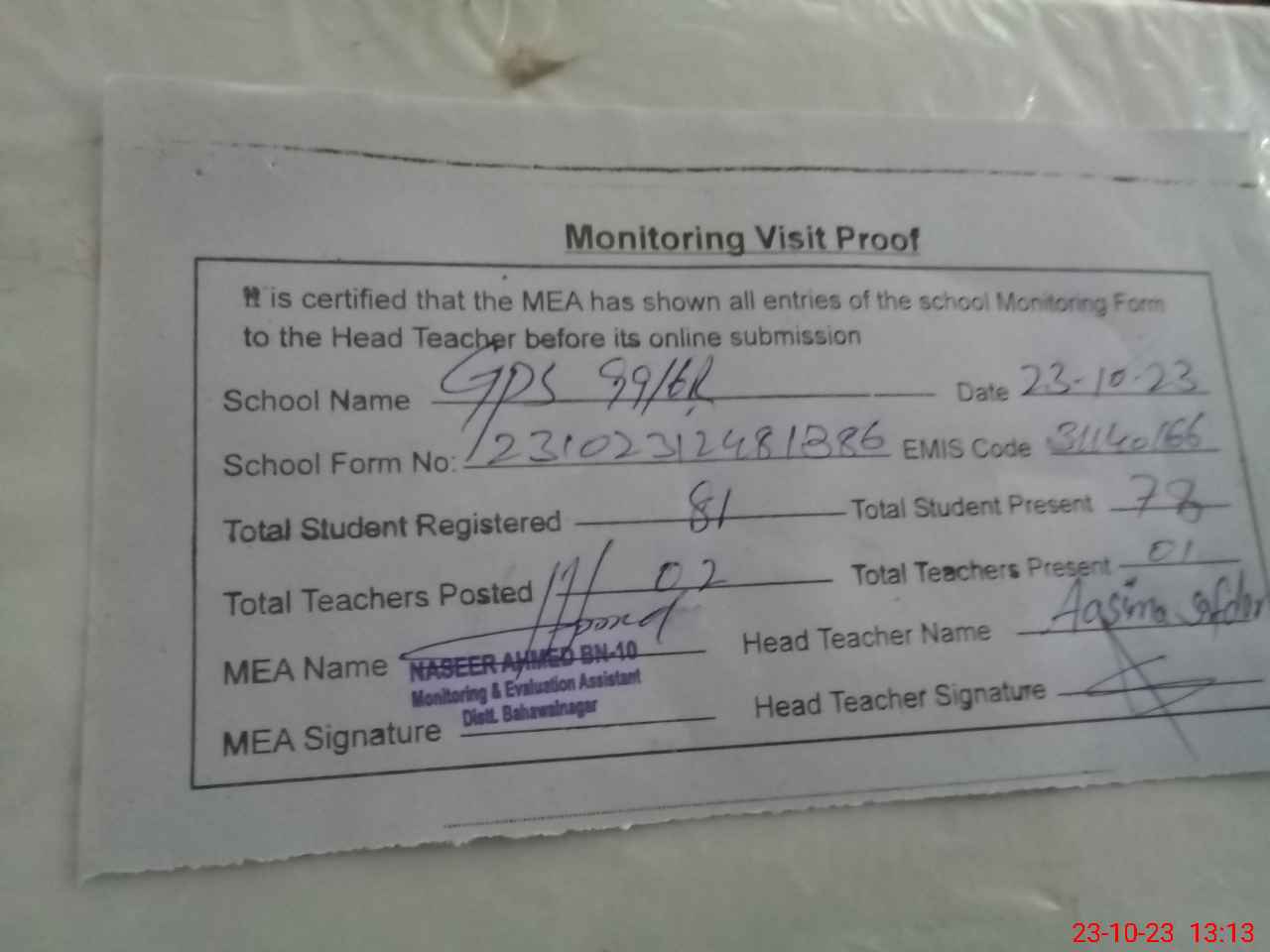 | Attendance Register | Head Teacher | MEA with School | Visit Proof |