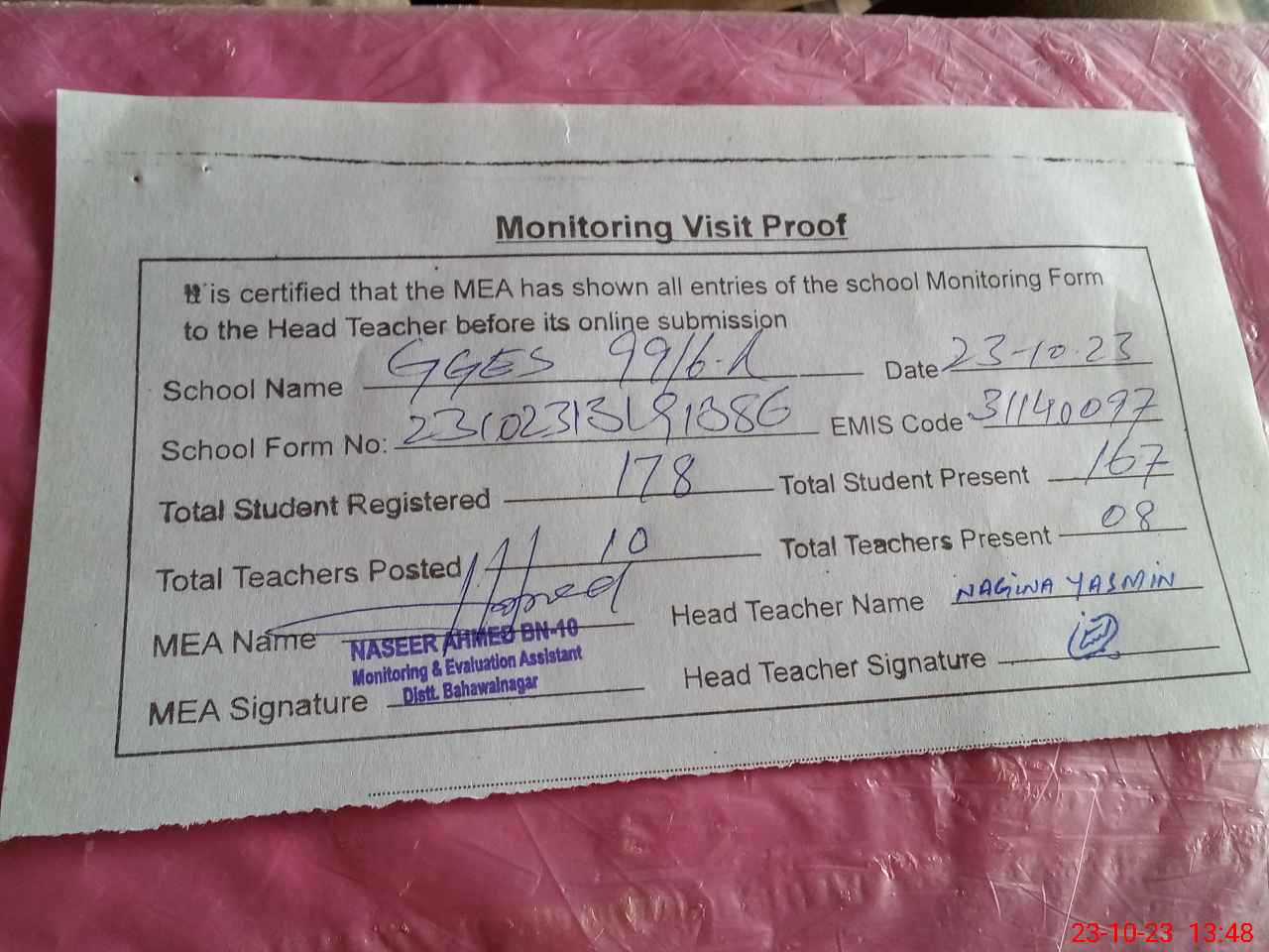 | Attendance Register | Head Teacher | MEA with School | Visit Proof |