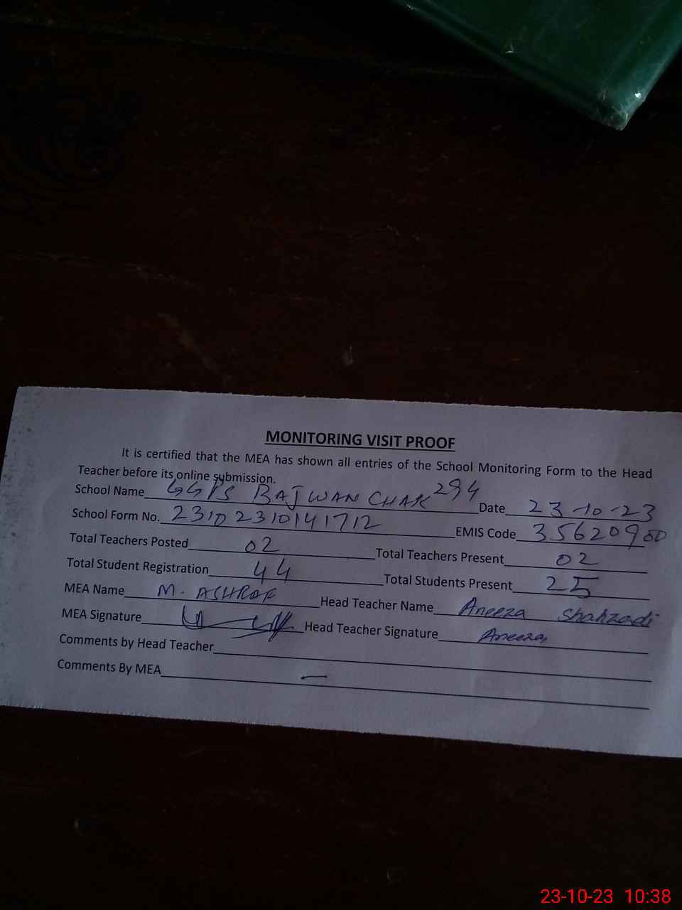 | Attendance Register | Head Teacher | MEA with School | Visit Proof |