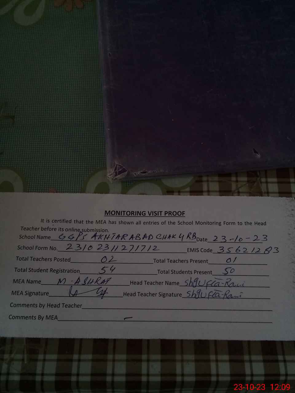 | Attendance Register | Head Teacher | MEA with School | Visit Proof |