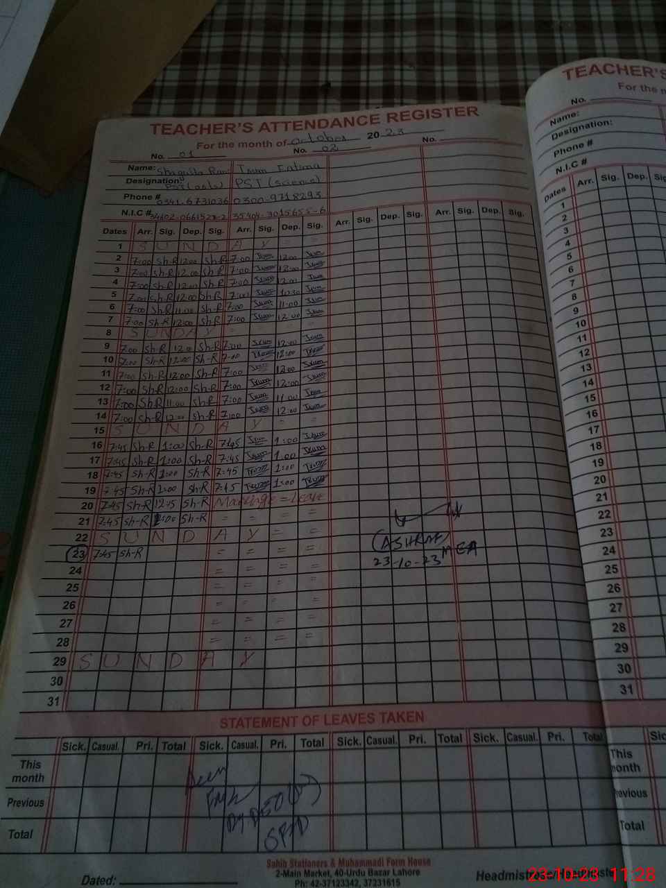 | Name: SH**** RA**** Designation: (School Headmaster's/Headmistress's) PST Phone/Cell Number: 03**** |