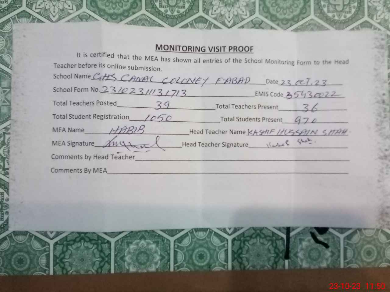 | Attendance Register | Head Teacher | MEA with School | Visit Proof |