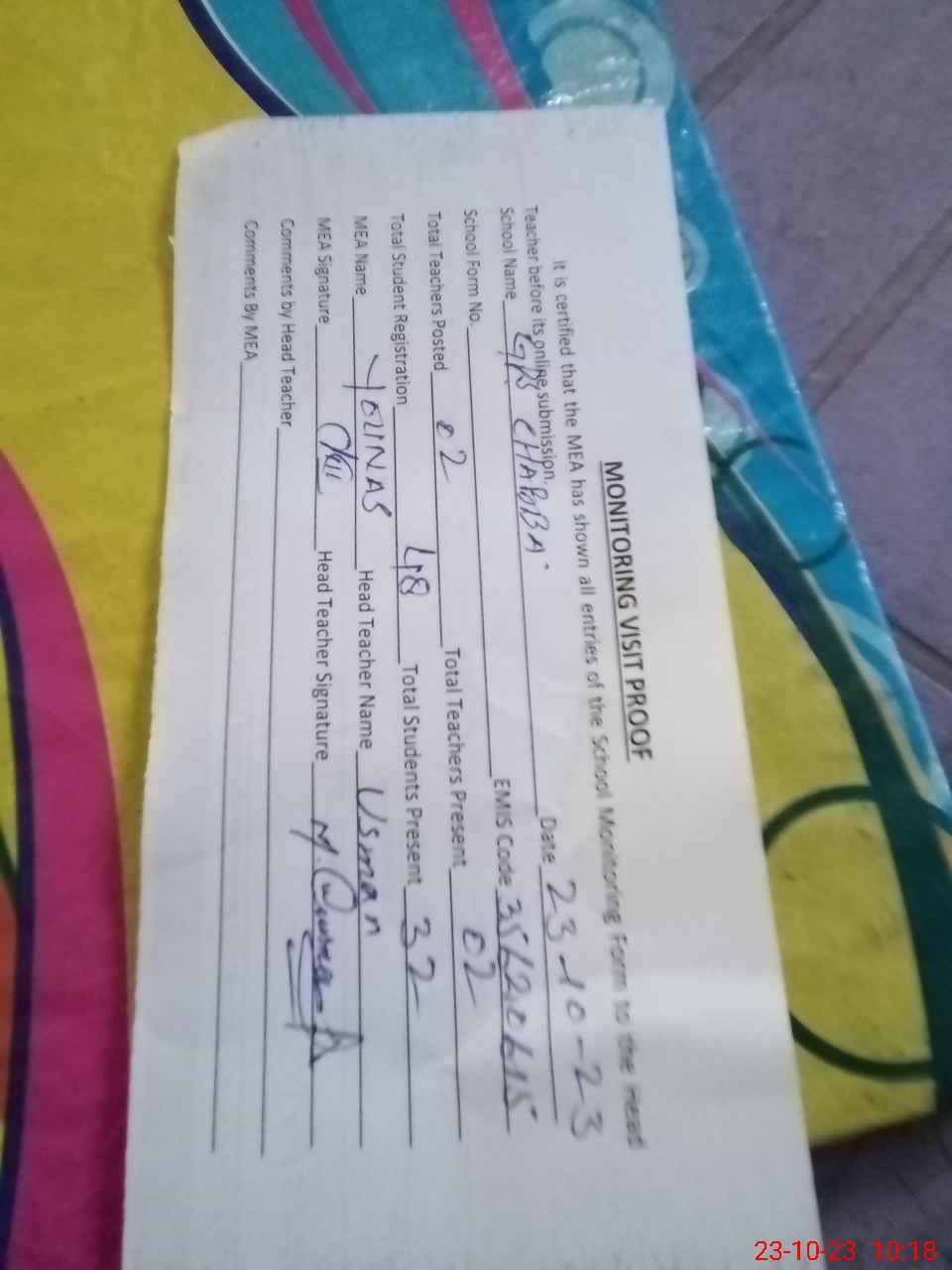 | Attendance Register | Head Teacher | MEA with School | Visit Proof |
