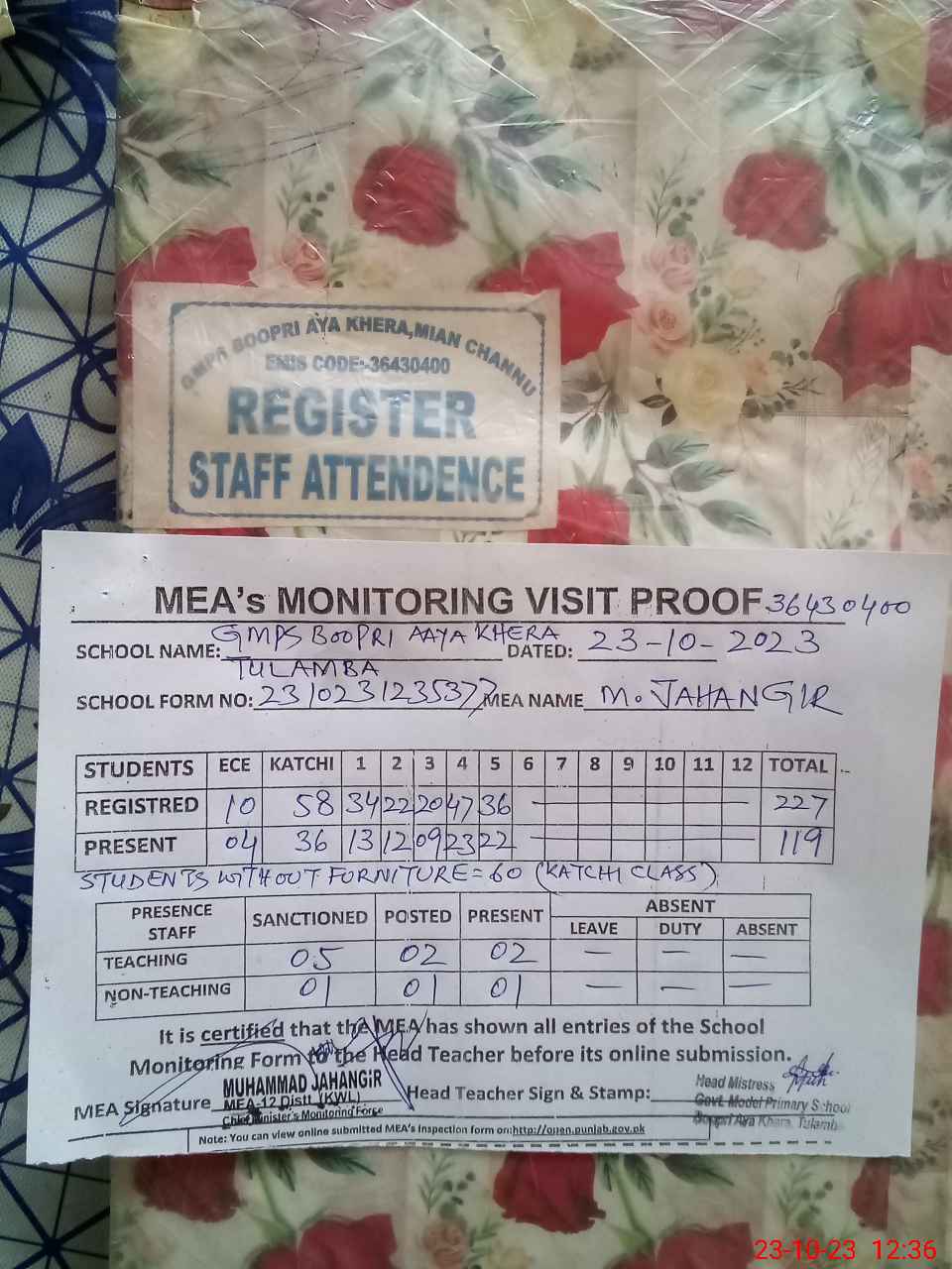 | Attendance Register | Head Teacher | MEA with School | Visit Proof |