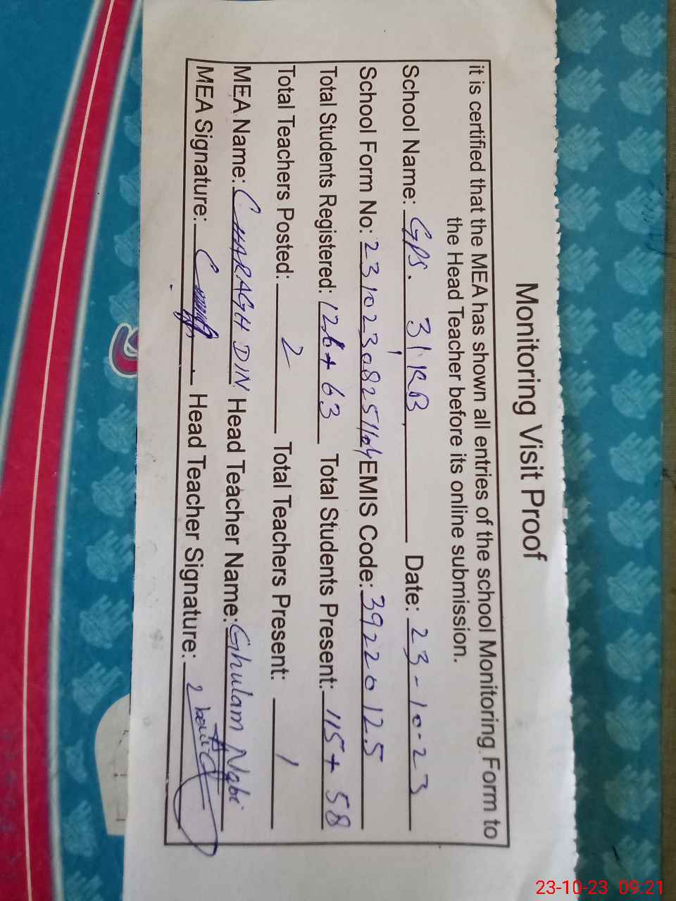 | Attendance Register | Head Teacher | MEA with School | Visit Proof |