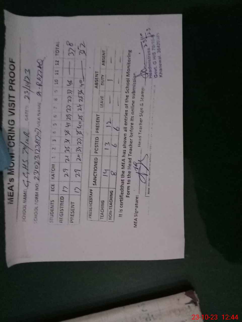 | Attendance Register | Head Teacher | MEA with School | Visit Proof |