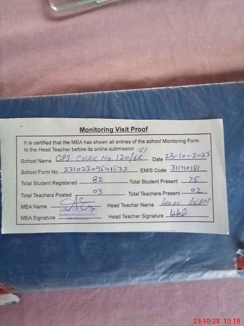 | Attendance Register | Head Teacher | MEA with School | Visit Proof |