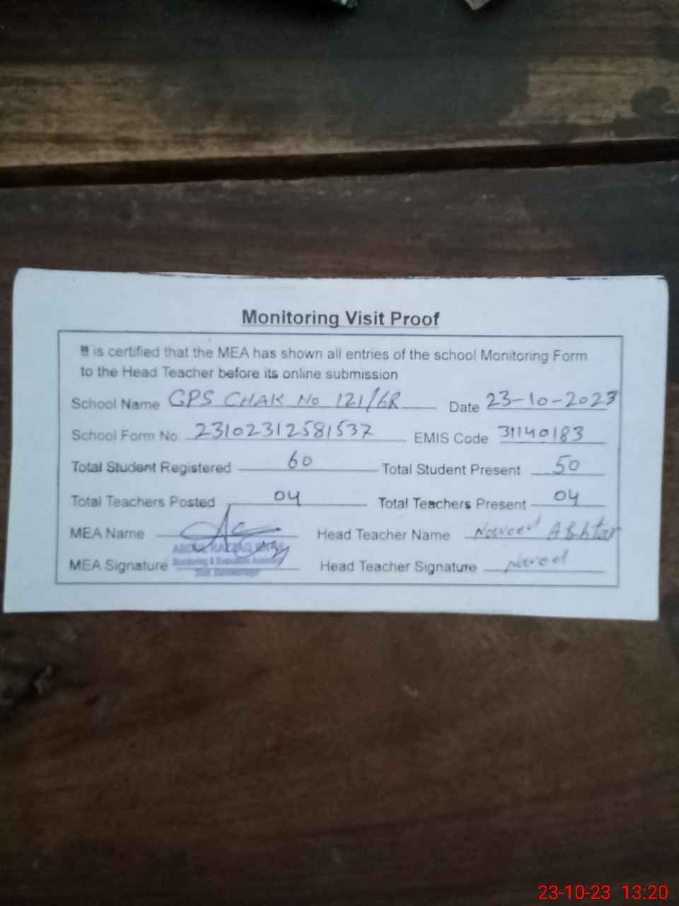 | Attendance Register | Head Teacher | MEA with School | Visit Proof |