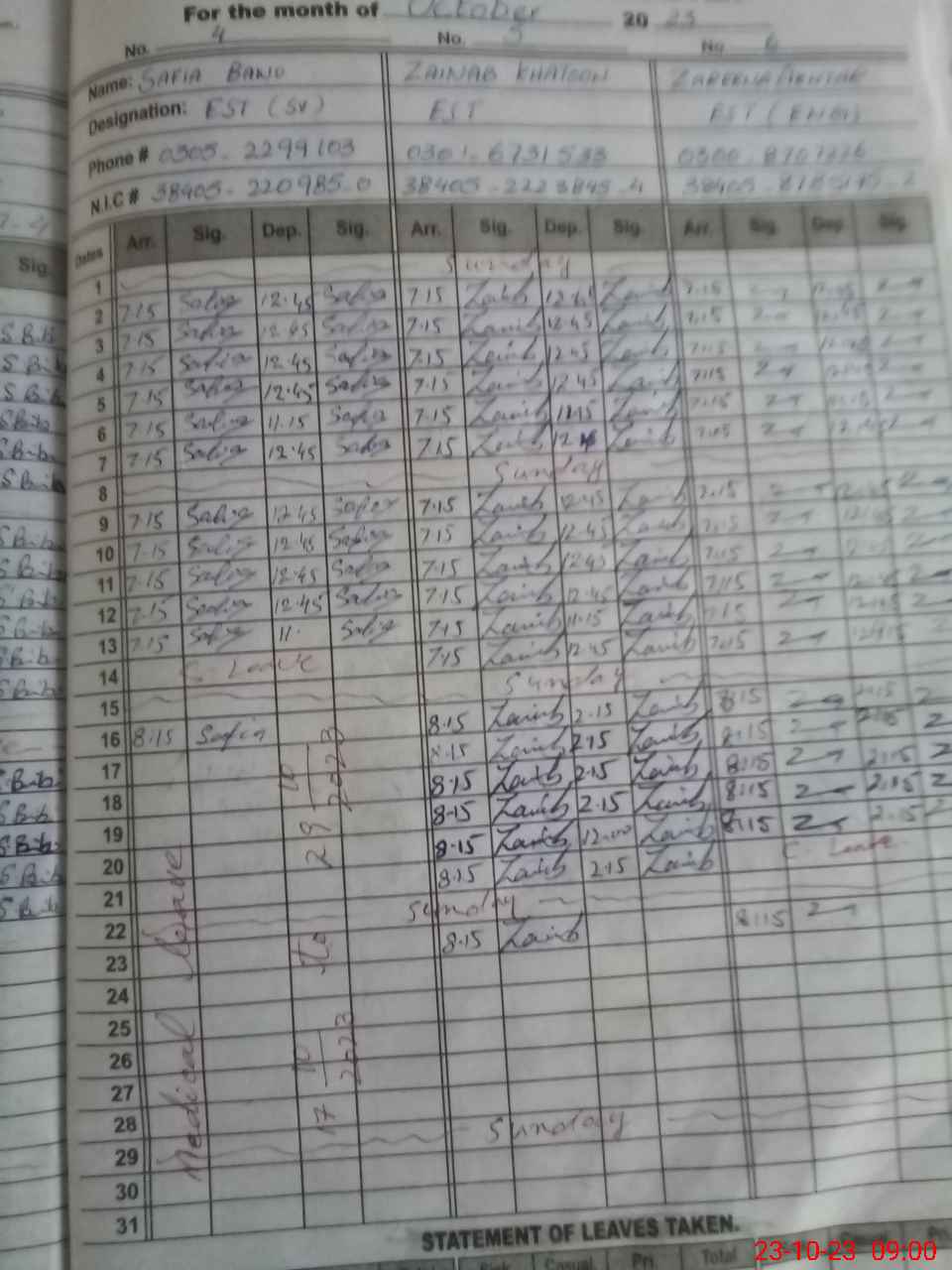 | CNIC | Full Name | Designation | R/C | Absence During Last Calender Month |