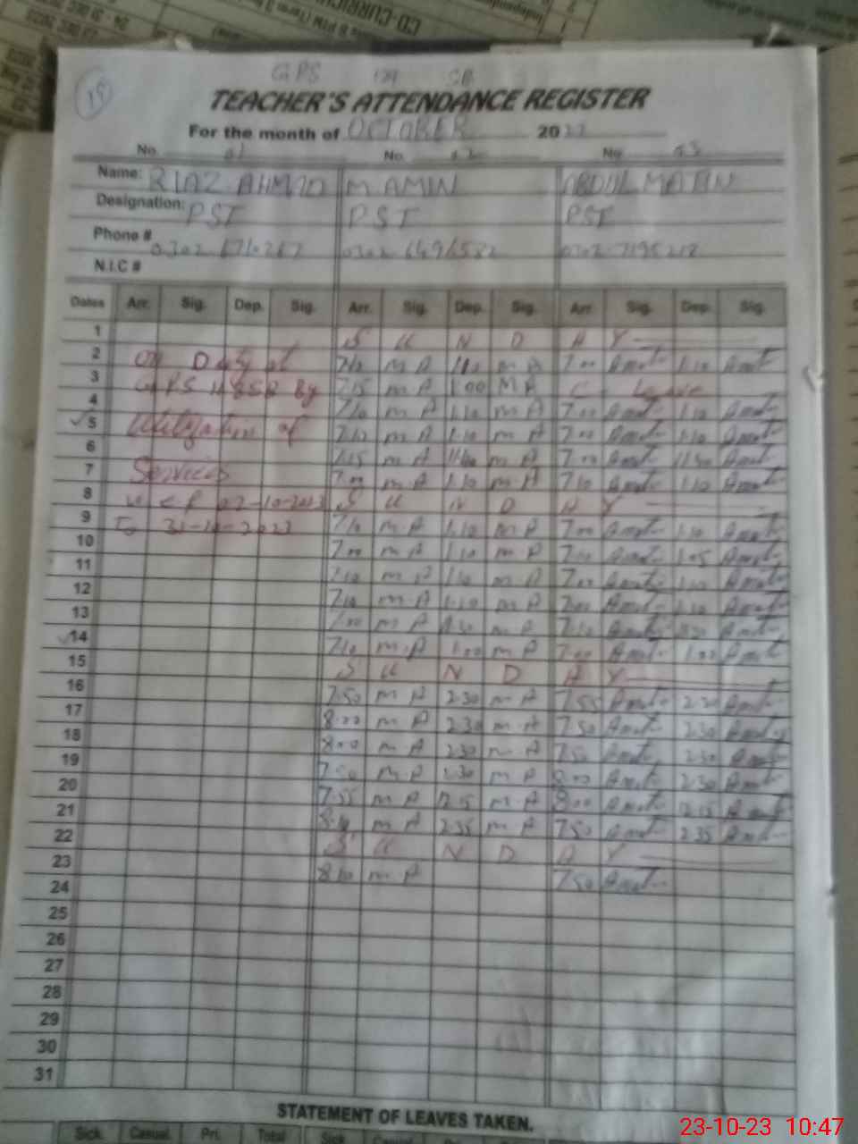 | Remarks (Use Separate Page if Required): PST Muhammad Riaz is on temporary duty from this school To GPS 118 SB dated 2 10 2023 to 31 10 2023 | |||||
