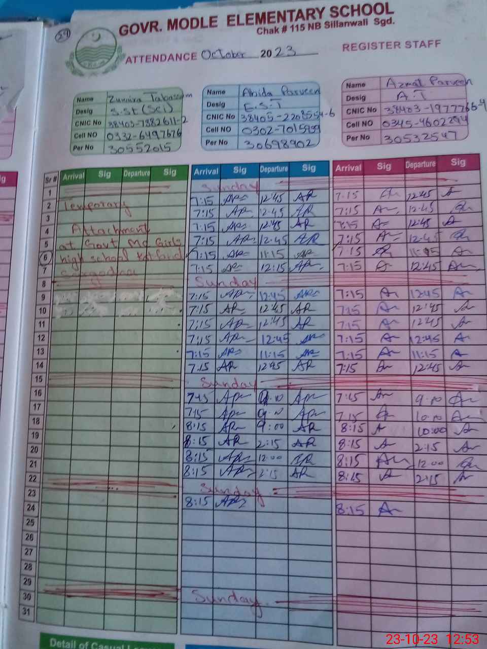 | Remarks (Use Separate Page if Required): SST Sunaira tabassum is on temporary duty from this school To GGHS M C kot Farid Sgd wef 02 09 2023 89 days Order no 3158 | |||||