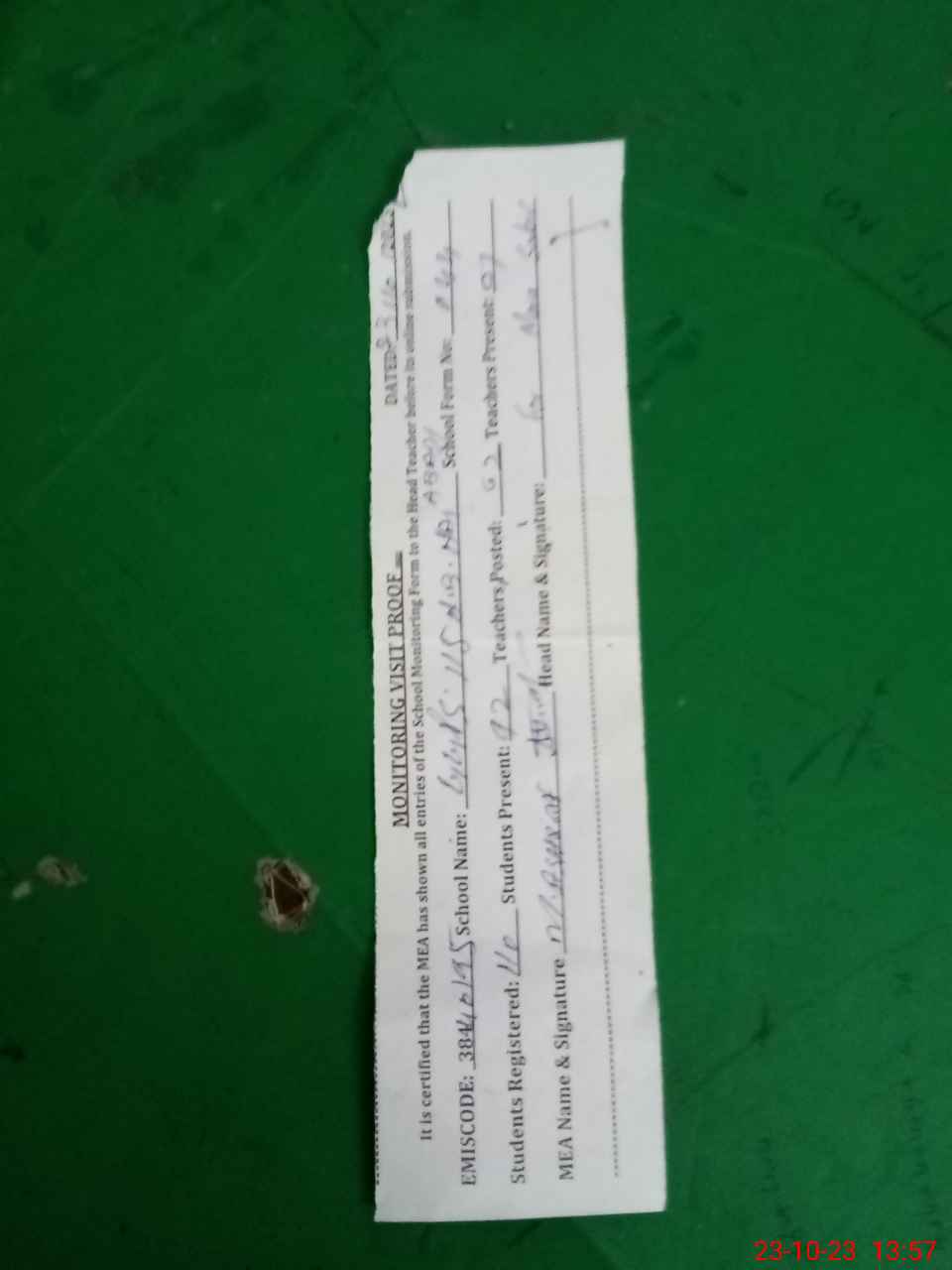 | Attendance Register | Head Teacher | MEA with School | Visit Proof |