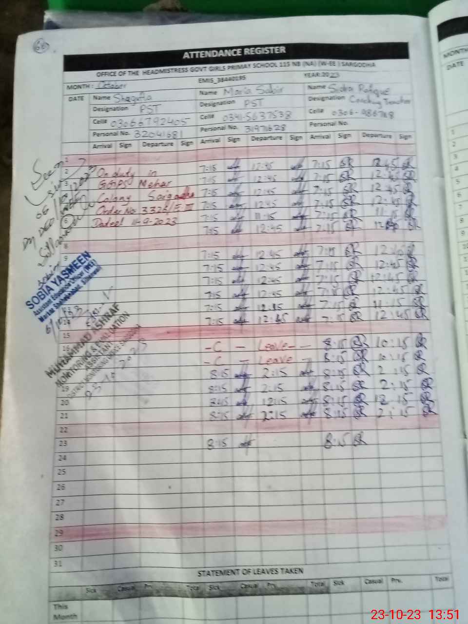 | Remarks (Use Separate Page if Required): Mst shagufta PST is on temporary duty from this school To GGPS Mehar colony sgd 11 09 2023 for 89 days | |||||