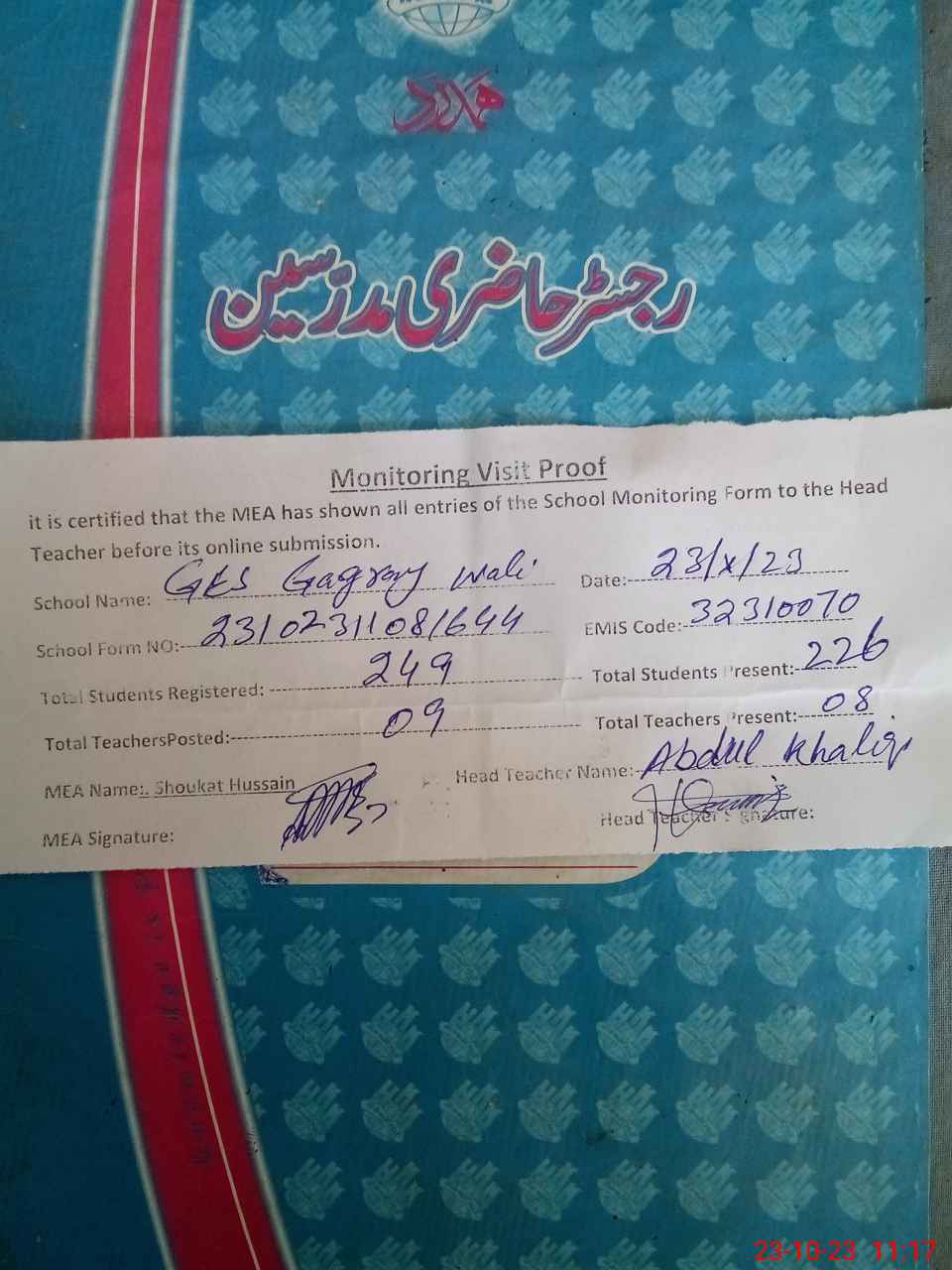 | Attendance Register | Head Teacher | MEA with School | Visit Proof |
