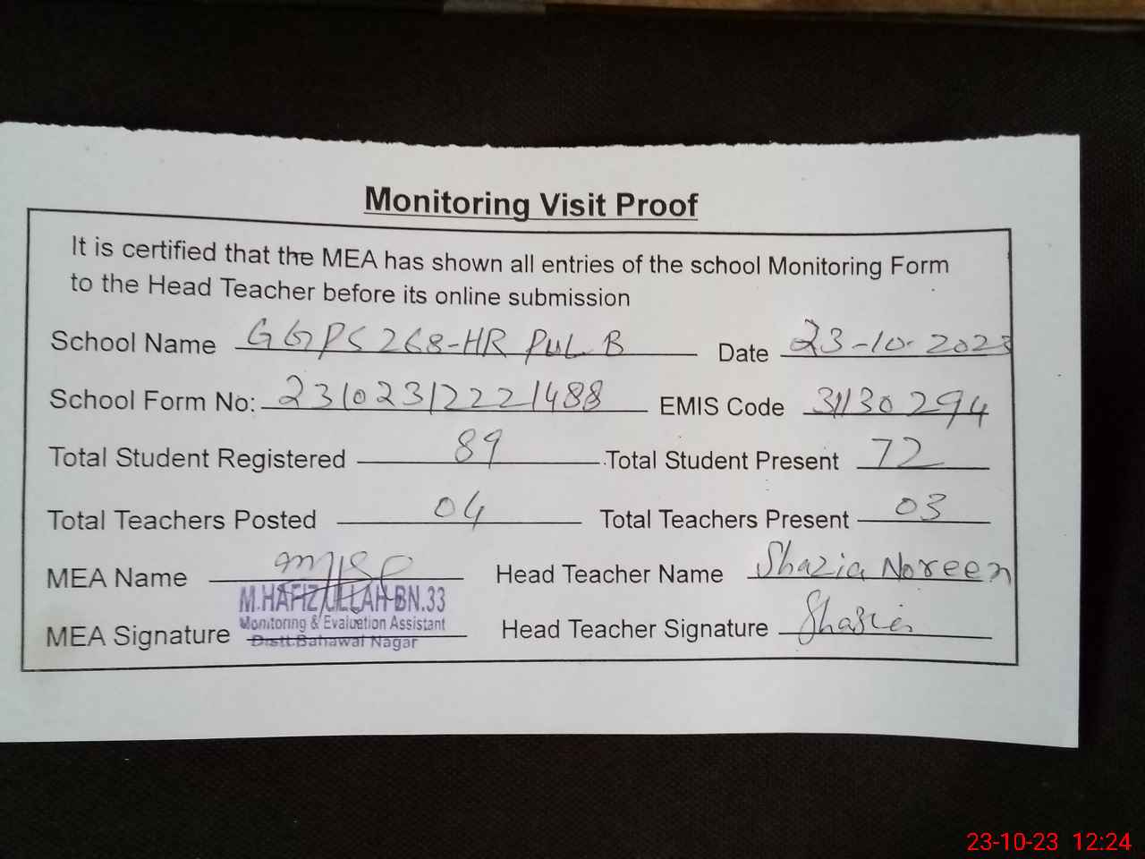| Attendance Register | Head Teacher | MEA with School | Visit Proof |