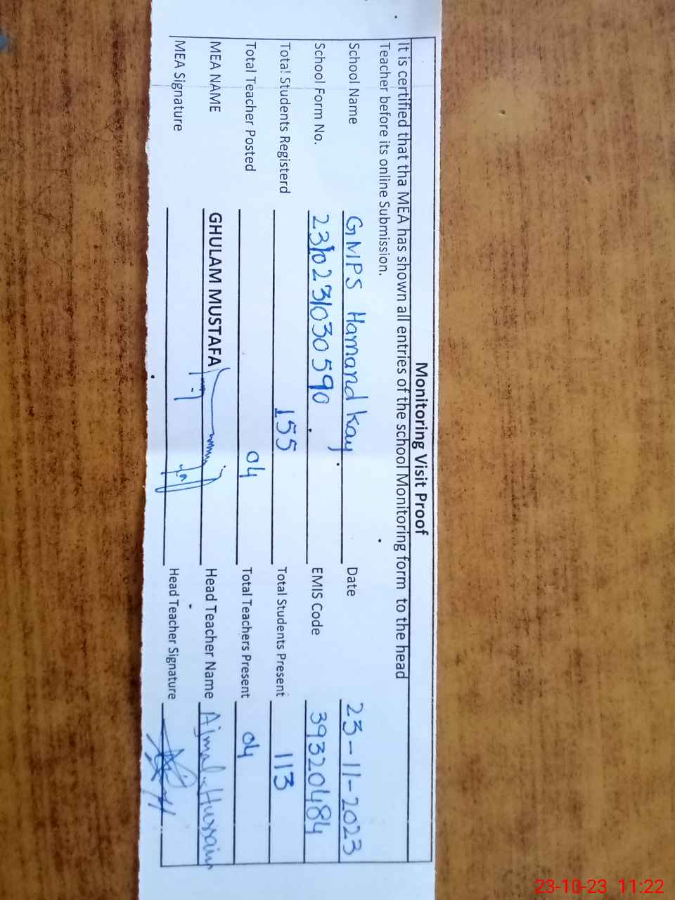 | Attendance Register | Head Teacher | MEA with School | Visit Proof |