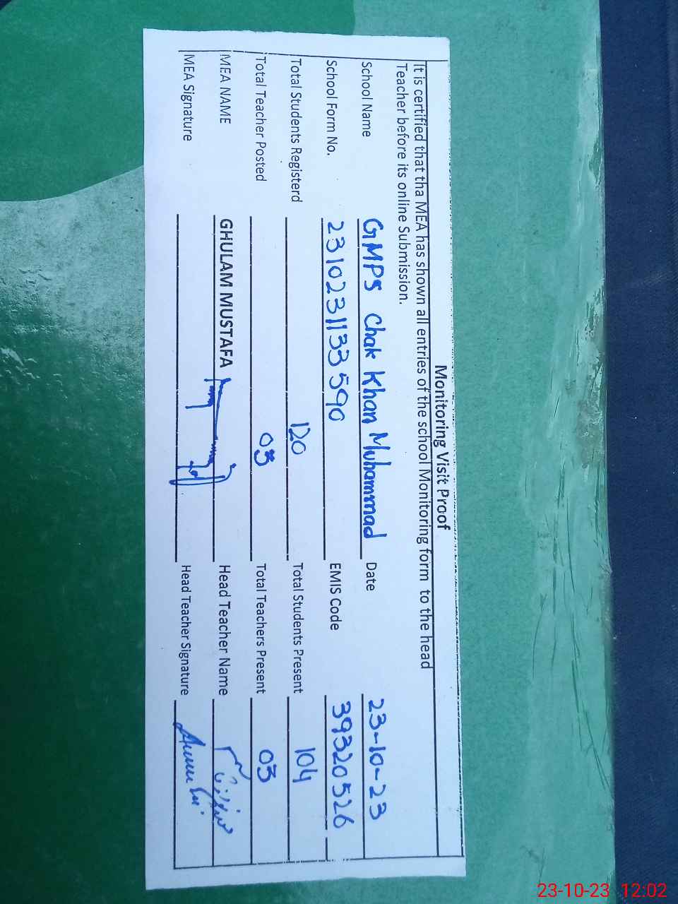 | Attendance Register | Head Teacher | MEA with School | Visit Proof |