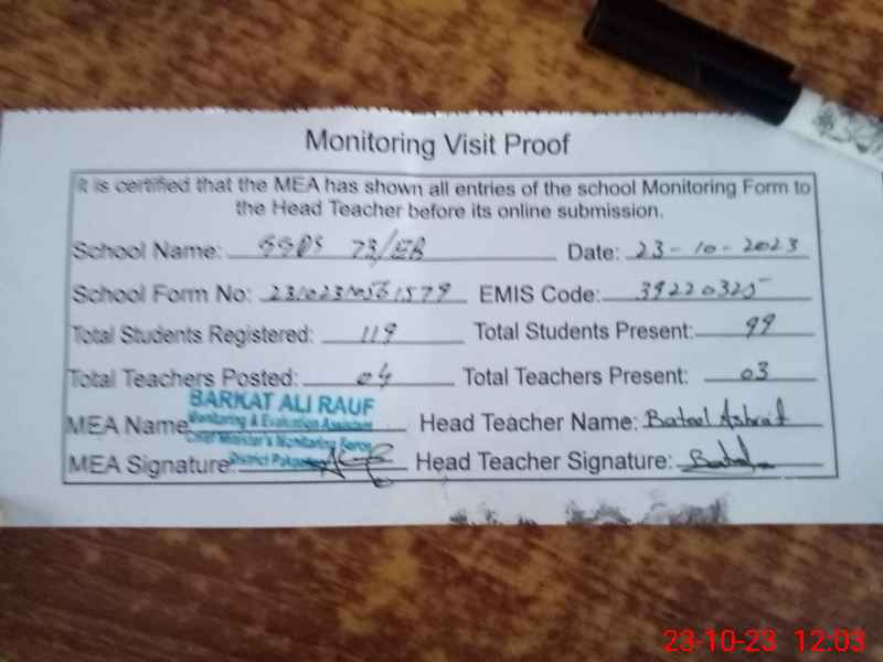 | School Visited by School Health & Nutrition Supervisor (No. of Visits) | 1 | Name1: | Mushtaq Ahmad Doger | Name2: | Nil |