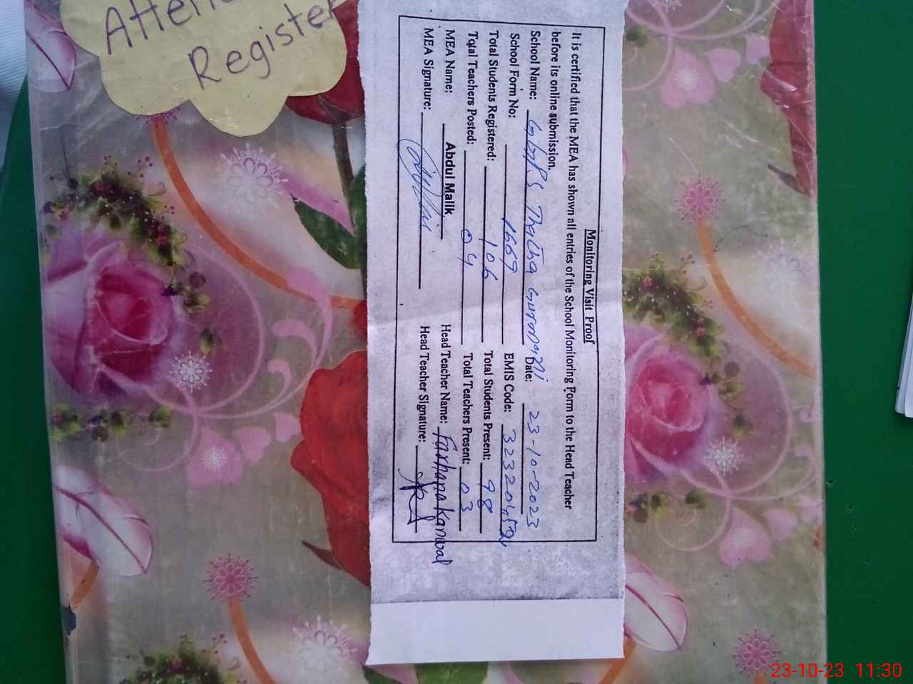 | Attendance Register | Head Teacher | MEA with School | Visit Proof |