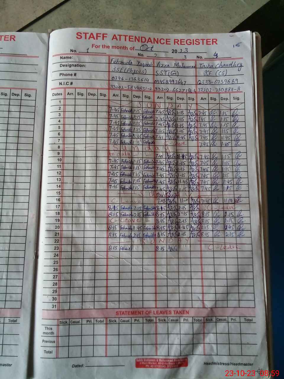 | CNIC | Full Name | Designation | R/C | Absence During Last Calender Month |