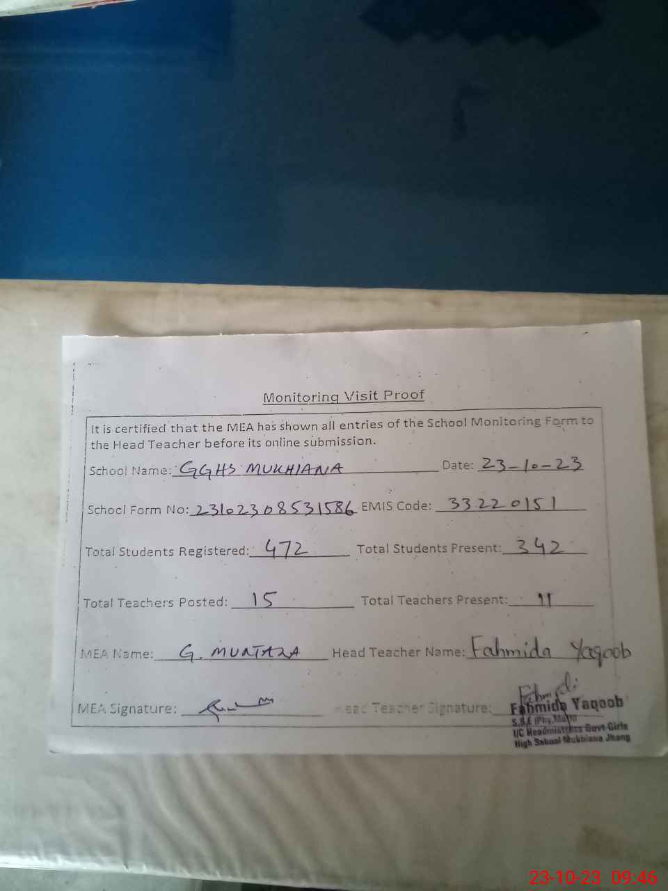 | Attendance Register | Head Teacher | MEA with School | Visit Proof |