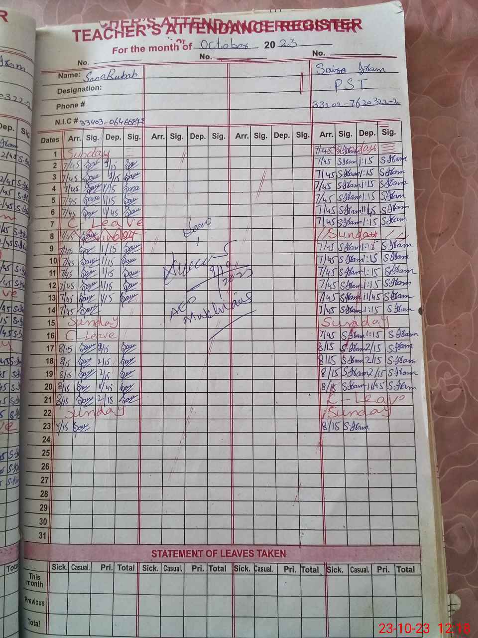 | Name: SA**** Ru**** Designation: (School Headmaster's/Headmistress's) PST Phone/Cell Number: 03**** |