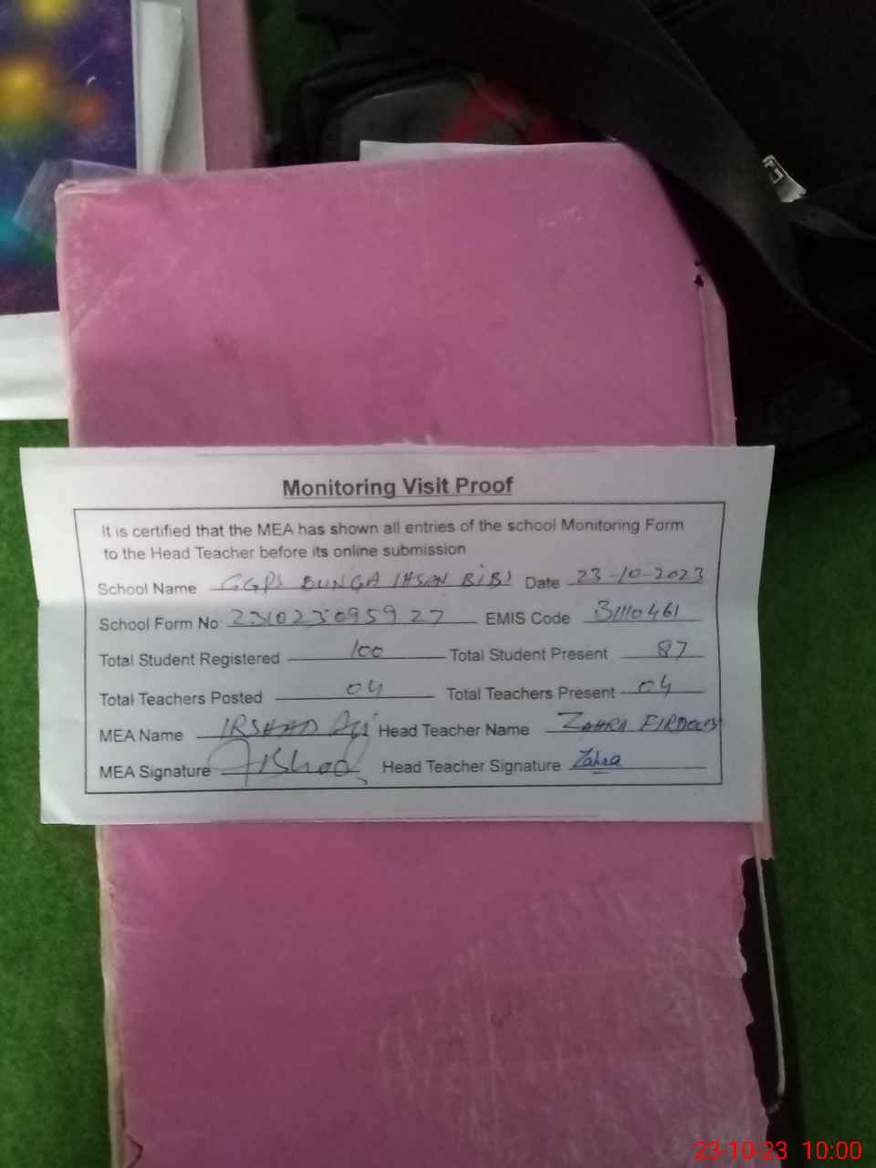 | Attendance Register | Head Teacher | MEA with School | Visit Proof |