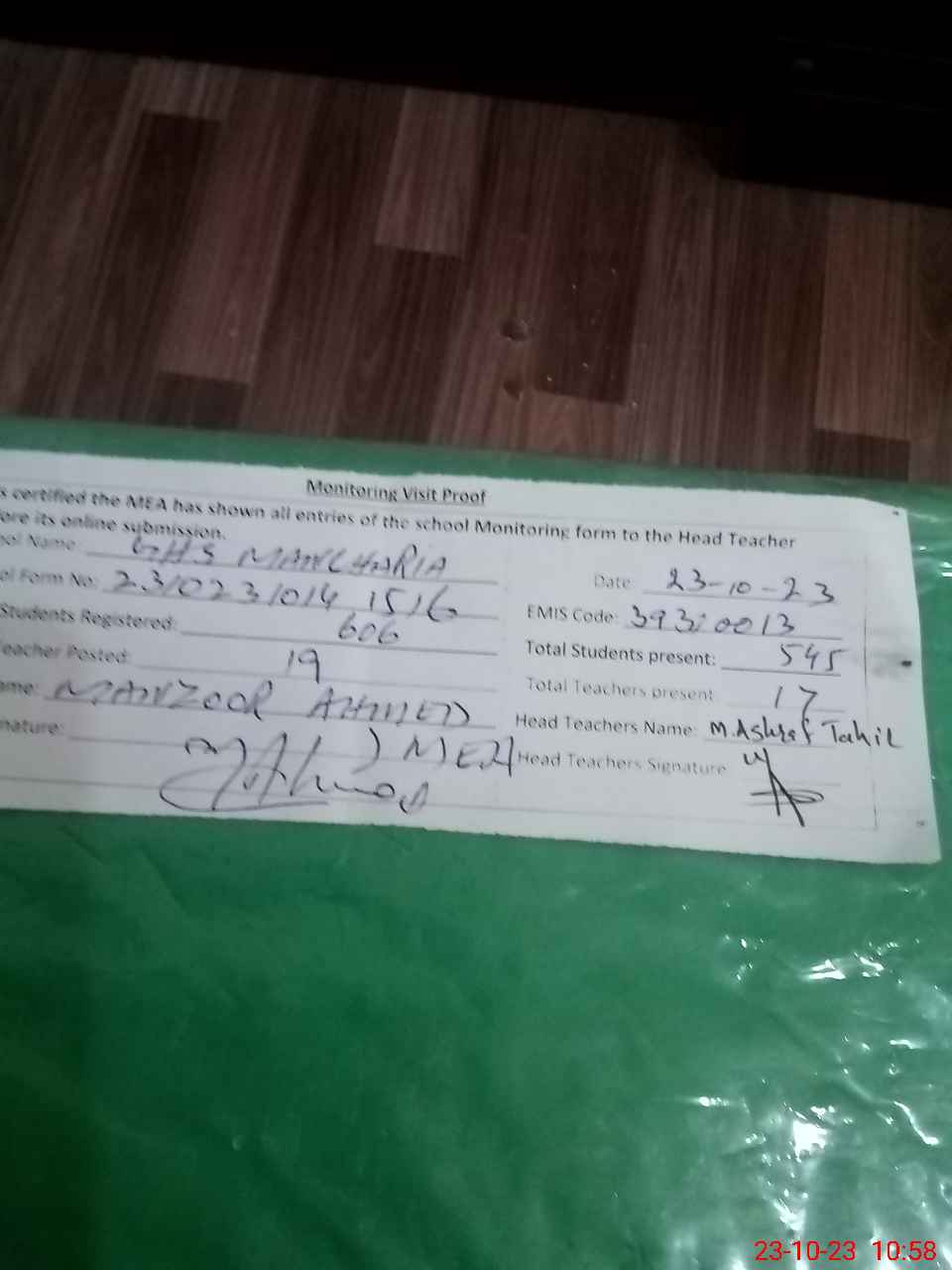 | Monitoring Date: 23-10-2023 | Start Time: 23-10-2023 10:14 AM | End Time: 23-10-2023 10:58 AM | Name of MEA: MA**** AH**** | |