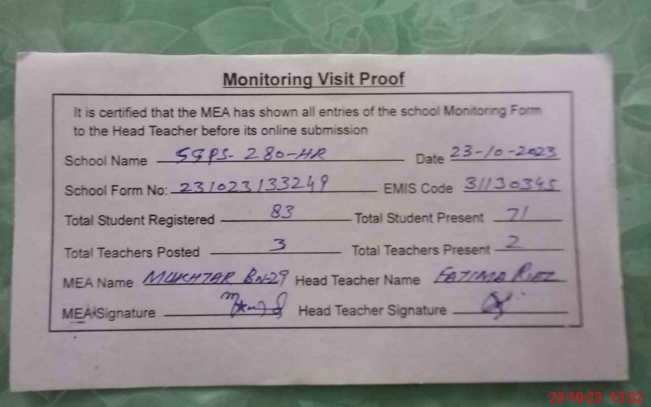 | Attendance Register | Head Teacher | MEA with School | Visit Proof |