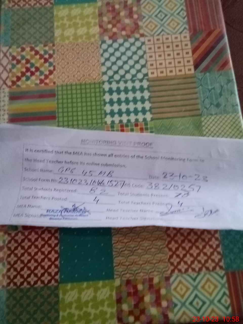 | Attendance Register | Head Teacher | MEA with School | Visit Proof |