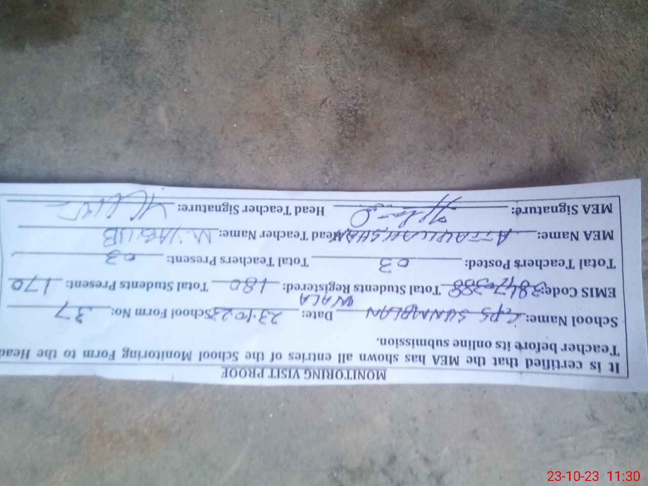 | Attendance Register | Head Teacher | MEA with School | Visit Proof |