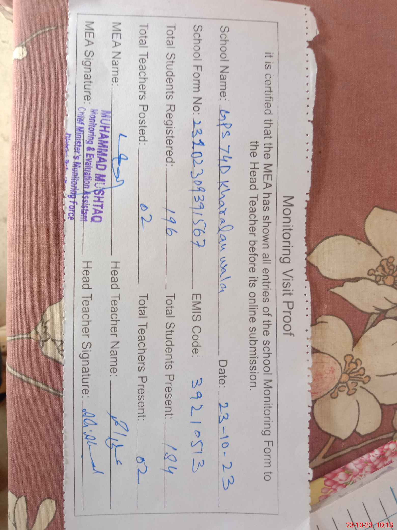 | Attendance Register | Head Teacher | MEA with School | Visit Proof |