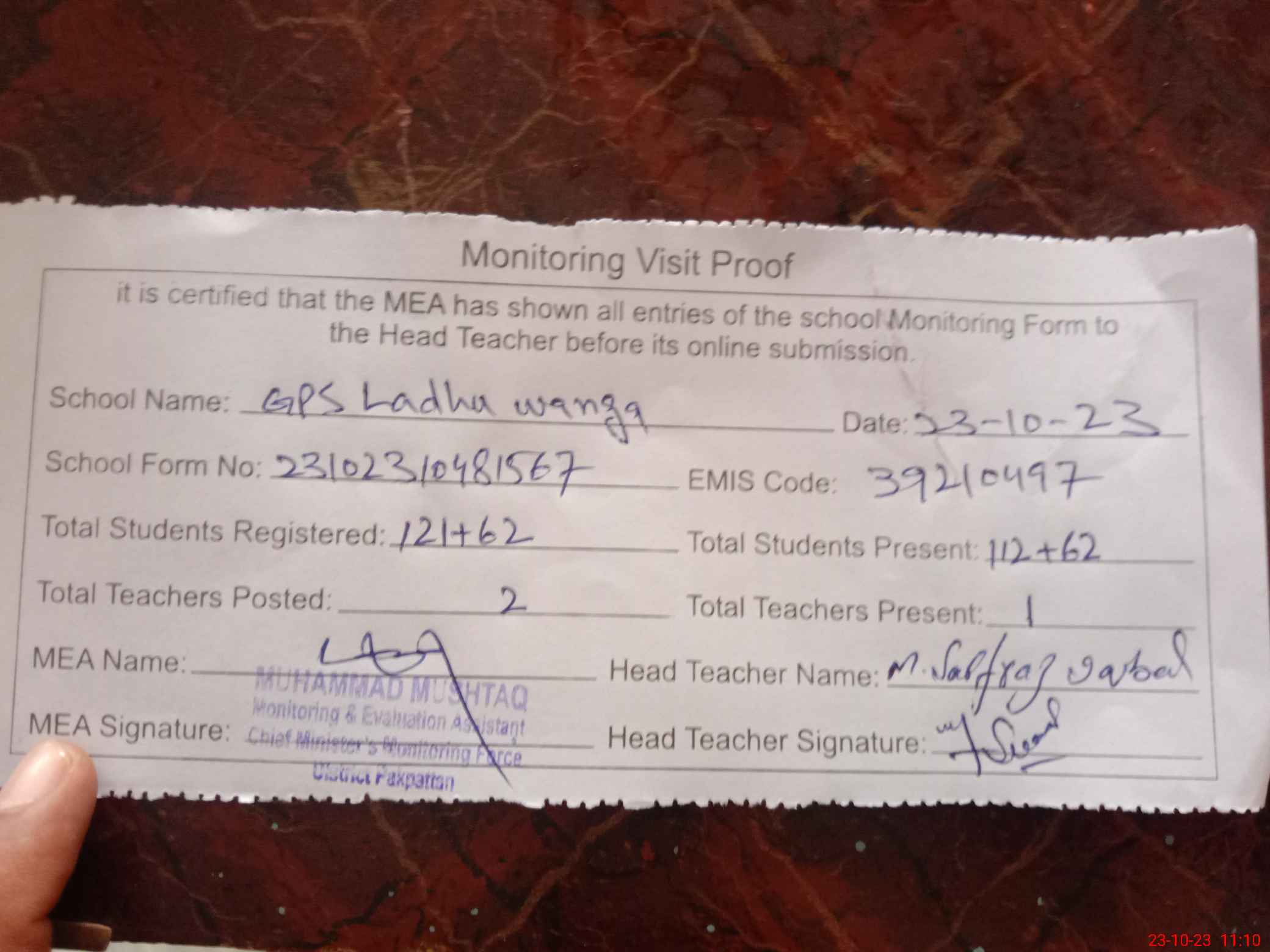 | Attendance Register | Head Teacher | MEA with School | Visit Proof |