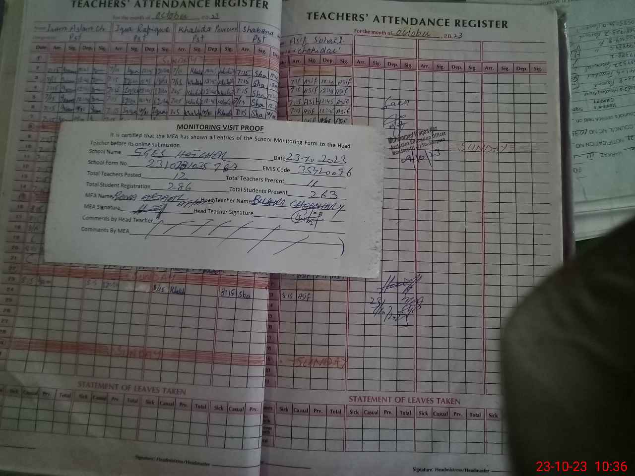 | Attendance Register | Head Teacher | MEA with School | Visit Proof |